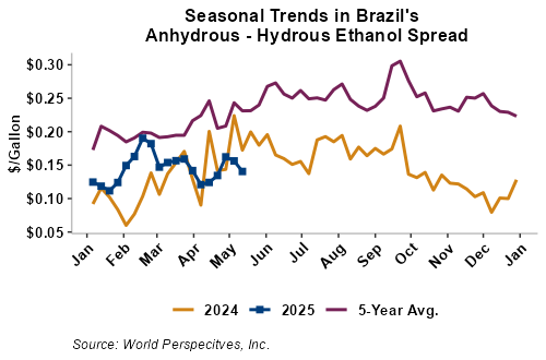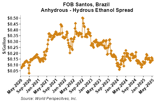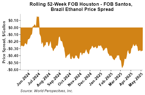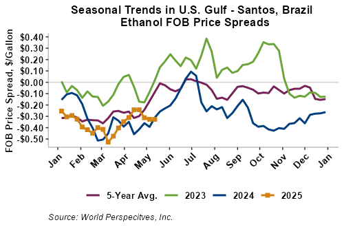 The FOB Gulf-Santos, Brazil ethanol spread has narrowed from last week’s close through Tuesday’s trading and is currently at -8.75 cents/liter (-33.11 cents/gallon).