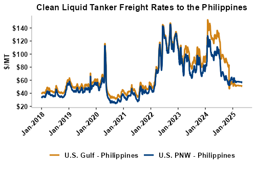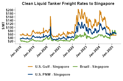 Liquid tanker rates are 1 percent lower on average this week with offers for the U.S. Gulf to West Africa seeing the largest gains (up 2 percent). Freight from the U.S. Gulf to the East Coast of Mexico saw the largest declines and is down 6 percent from last week. On average, tanker freight from the U.S. Gulf is down 1 percent this week while freight from the PNW has posted a 1 percent decline. Liquid tanker freight rates from Brazil are down 0.1 percent, on average, this week. Freight rates across all origins are 24 percent lower than this same week in 2024.