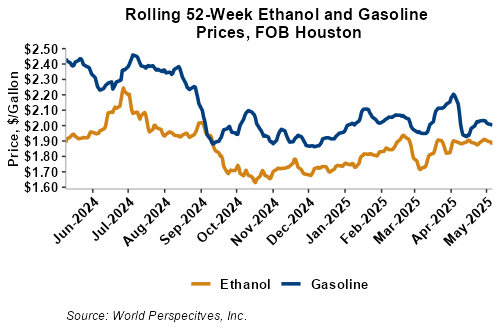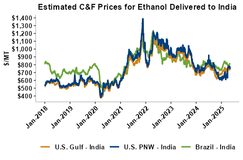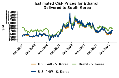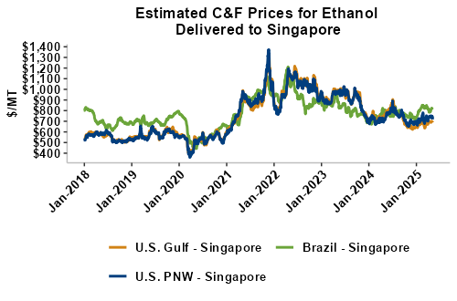 On a cost-and-freight (C&F) basis, offers are mostly lower this week as both freight rates and FOB ethanol offers have moved below last week’s values. Prices for ethanol C&F to Central America from the U.S. Gulf are down 1.4 percent this week and are up 1.1 percent from this same week in 2024. Values for PNW ethanol to Southeast Asia average $711.9/MT this week, down 3.4 percent from the prior week and down 1 percent year-over-year. That compares to U.S. Gulf to Southeast Asia C&F prices that average $700.13/MT and are down 1.4 percent from last week and are down 6.7 percent year-over-year. C&F prices for Brazilian ethanol to Southeast Asia are down 0.4 percent from last week.