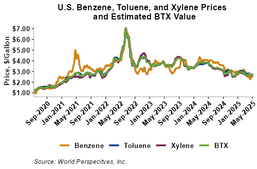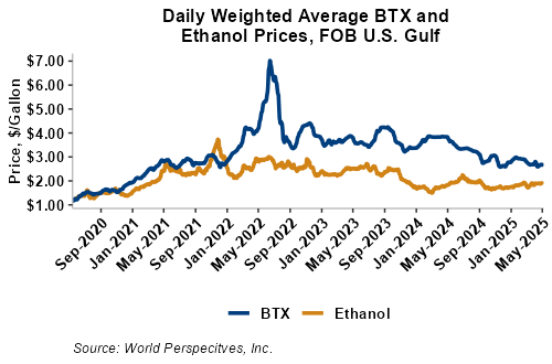 BTX component prices were mixed last week but turned lower through Tuesday’s market close: Benzene was down 0.9 percent while Toluene was down 1.7 percent, and Xylene was down 1.9 percent. The estimated weighted average aromatic price is currently 69.45 cents/liter (262.91 cents/gallon), down from last Friday’s close. The BTX-Houston ethanol spread narrowed last week, and the weighted average BTX price is 19.84 cents/liter (75.12 cents/gallon) higher than the FOB Houston ethanol price.