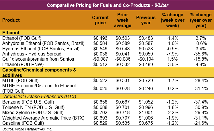FOB Houston ethanol prices finished last week 0.6 percent higher but are down 1.1 percent through Tuesday’s trading from Friday’s close. FOB Houston ethanol prices are quoted at 49.61 cents/liter (187.79 cents/gallon). FOB Santos, Brazil anhydrous ethanol prices were higher last week; they are down in early week trading, falling 1 percent to 58.35 cents/liter (220.8925 cents/gallon) through Tuesday’s close.