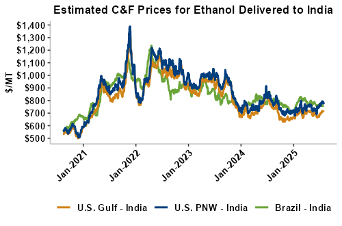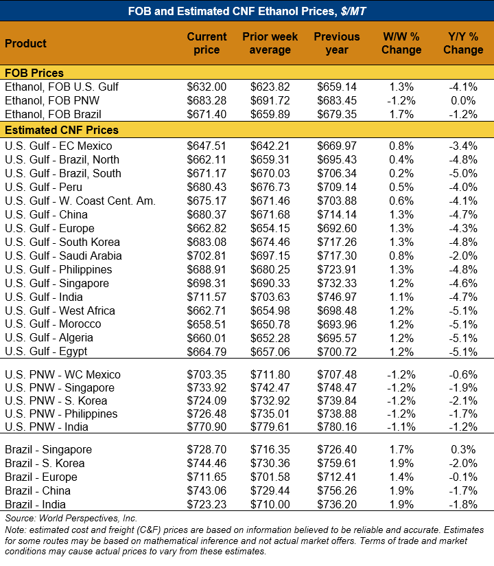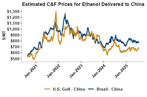 On a cost-and-freight (C&F) basis, offers are mostly higher this week as higher FOB offers for ethanol offset lower freight rates. Prices for ethanol C&F to Central America from the U.S. Gulf are up 0.6 percent this week and are down 3.8 percent from this same week in 2024. Values for PNW ethanol to Southeast Asia average $728.16/MT this week, down 1.2 percent from the prior week and down 1.9 percent year-over-year. That compares to U.S. Gulf to Southeast Asia C&F prices that average $690.1/MT and are up 1.2 percent from last week but are down 4.7 percent year-over-year. C&F prices for Brazilian ethanol to Southeast Asia are up 1.7 percent from last week.