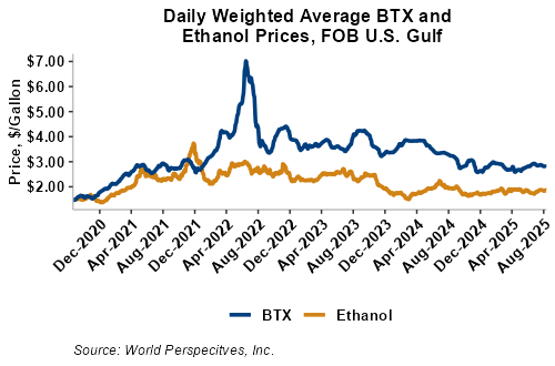 BTX component prices were mixed last week and continued that trend through Tuesday’s market close: Benzene was down 2 percent while Toluene was up 0.7 percent, and Xylene was down 0.8 percent. The estimated weighted average aromatic price is currently 74.04 cents/liter (280.28 cents/gallon), down from last Friday’s close. The BTX-Houston ethanol spread narrowed last week, and the weighted average BTX price is 24.62 cents/liter (93.21 cents/gallon) higher than the FOB Houston ethanol price.