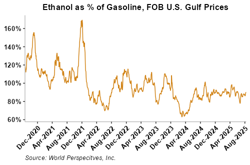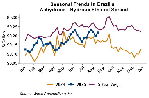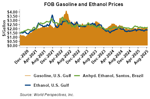 The FOB Gulf-Santos, Brazil ethanol spread has widened from last week’s close through Tuesday’s trading and is currently at -8.91 cents/liter (-33.71 cents/gallon).