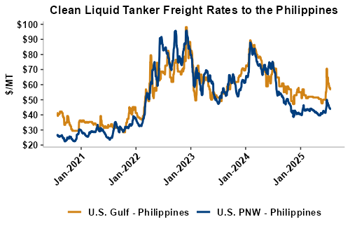 Liquid tanker rates across all origins are, on average, steady with last week’s values but offers for Brazil to India have seen the largest gains (up 7 percent). Freight from the U.S. Gulf to Saudi Arabia saw the largest declines and is down 6 percent from last week. On average, tanker freight from the U.S. Gulf is down 2 percent this week while freight from the PNW has posted a 1 percent decline. Liquid tanker freight rates from Brazil are up 3 percent, on average, this week. Freight rates across all origins are 27 percent lower than this same week in 2024.