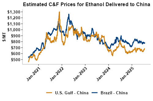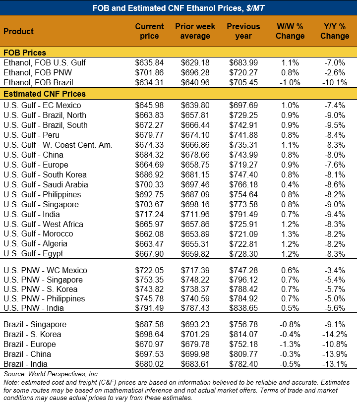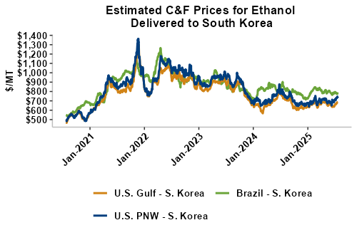 On a cost-and-freight (C&F) basis, offers are mostly higher this week as higher FOB ethanol offers are combined with steady freight rates. Prices for ethanol C&F to Central America from the U.S. Gulf are up 1 percent this week and are down 8 percent from this same week in 2024. Values for PNW ethanol to Southeast Asia average $747.65/MT this week, up 0.7 percent from the prior week but down 5.3 percent year-over-year. That compares to U.S. Gulf to Southeast Asia C&F prices that average $694.45/MT and are up 0.8 percent from last week but are down 8.4 percent year-over-year. C&F prices for Brazilian ethanol to Southeast Asia are down 0.7 percent from last week.