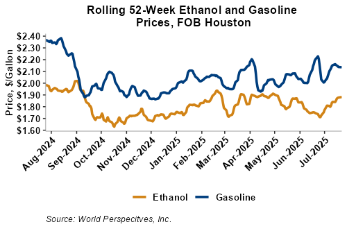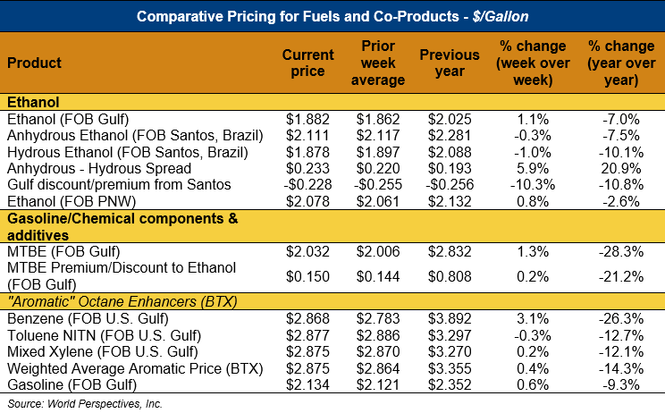Market Outlook: U.S. ethanol prices ended last week 2 percent higher and were mostly steady in early week trading, posting a gain of 0.1 percent through Tuesday’s close. Midwest wholesale rack ethanol prices were higher to end last week but were down 0.1 percent through Tuesday’s market close to their last quote of 50.52 cents/liter (191.24 cents/gallon).