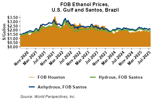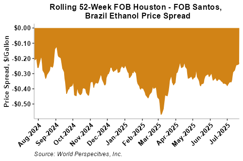 The FOB Gulf-Santos, Brazil ethanol spread has narrowed from last week’s close through Tuesday’s trading and is currently at -6.03 cents/liter (-22.84 cents/gallon).