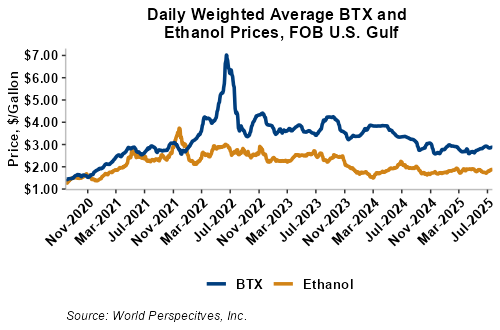 BTX component prices were mixed last week and continued that trend through Tuesday’s market close: Benzene was up 2.8 percent while Toluene was down 0.2 percent, and Xylene was up 0.2 percent. The estimated weighted average aromatic price is currently 75.96 cents/liter (287.55 cents/gallon), up from last Friday’s close. The BTX-Houston ethanol spread widened last week, and the weighted average BTX price is 26.24 cents/liter (99.34 cents/gallon) higher than the FOB Houston ethanol price.