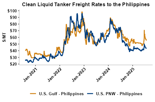 Liquid tanker rates are 3 percent higher on average this week with offers for the U.S. Gulf to the East Coast of Mexico seeing the largest gains (up 29 percent). Freight from the U.S. Gulf to China saw the largest declines and is down 2 percent from last week. On average, tanker freight from the U.S. Gulf is up 5 percent this week while freight from the PNW has posted a 1 percent decline. Liquid tanker freight rates from Brazil are up 2 percent, on average, this week. Freight rates across all origins are 20 percent lower than this same week in 2024.