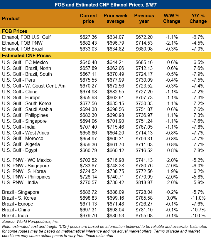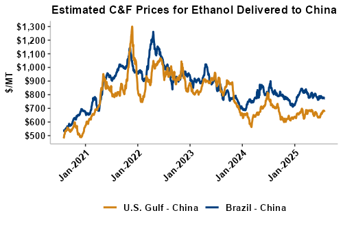 On a cost-and-freight (C&F) basis, offers are mostly lower this week as lower FOB offers for ethanol have offset gains in liquid tanker freight rates. Prices for ethanol C&F to Central America from the U.S. Gulf are down 0.4 percent this week and are down 7.1 percent from this same week in 2024. Values for PNW ethanol to Southeast Asia average $728.11/MT this week, down 1.9 percent from the prior week and down 6 percent year-over-year. That compares to U.S. Gulf to Southeast Asia C&F prices that average $684.97/MT and are down 1.1 percent from last week and are down 7.4 percent year-over-year. C&F prices for Brazilian ethanol to Southeast Asia are down 0.1 percent from last week.