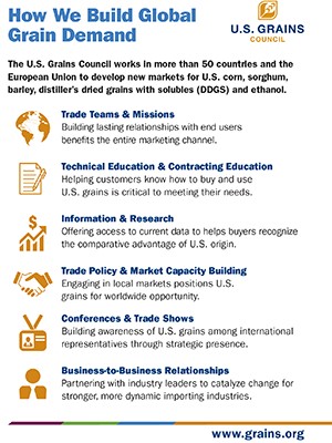 The U.S. Grains Council (USGC) works around the clock and around the globe to find and expand new pockets of demand for U.S. corn, barley, sorghum, ethanol, distiller’s dried grains with solubles (DDGS) and other co-products.