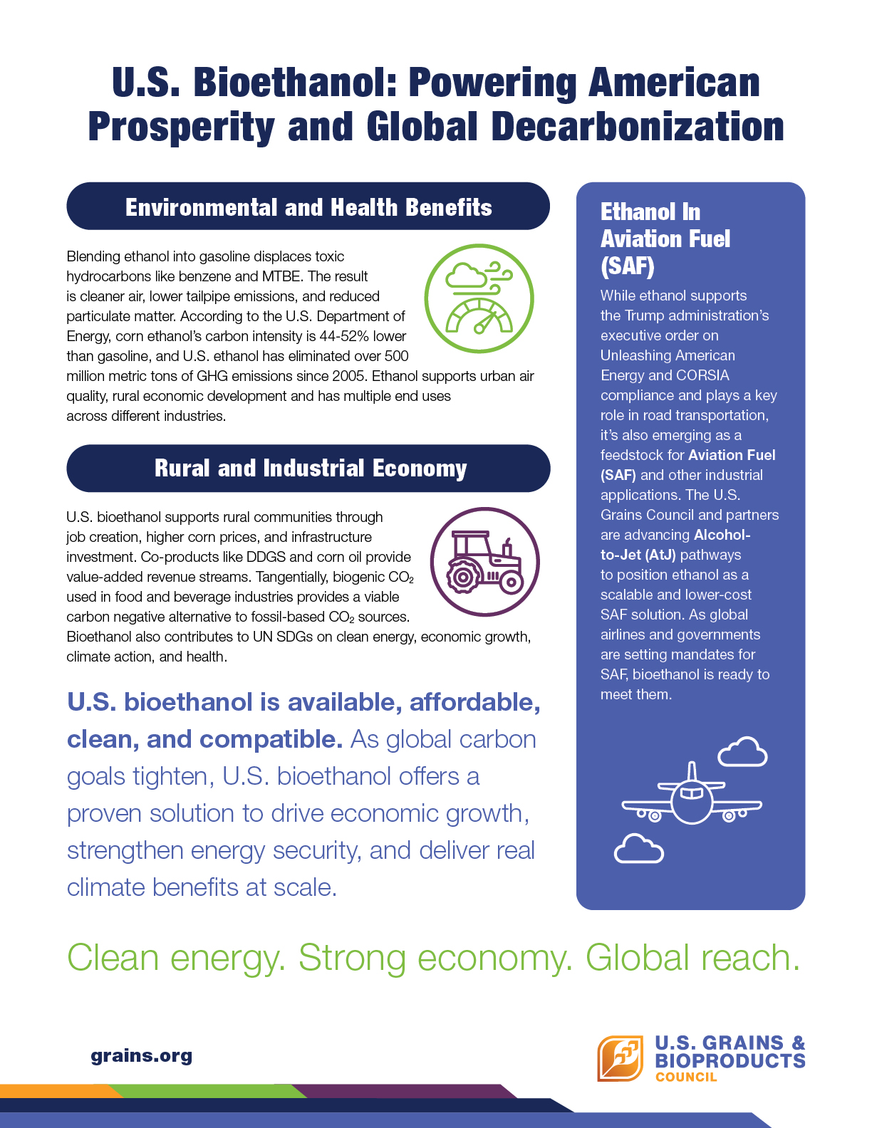 At the U.S. Grains & BioProducts Council, we believe biofuels such as bioethanol are vital to international transportation decarbonization efforts; and are dedicated to helping countries meet their global climate commitments as they fuel forward to a net-zero world. U.S. bioethanol provides an immediate solution to decarbonize road transportation with long-term potential to decarbonize long-haul trucking, aviation, and maritime transport. Bioethanol is: