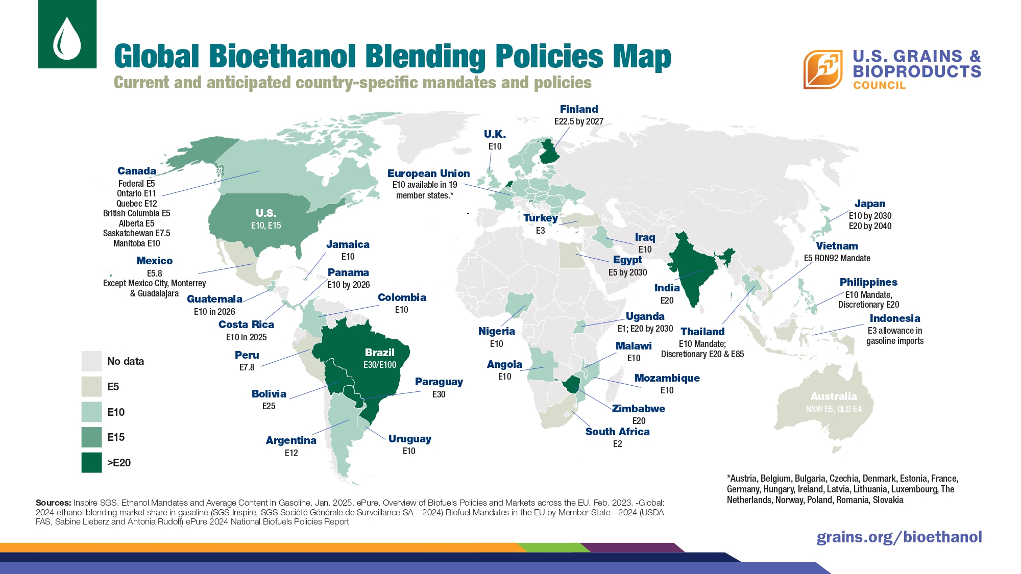 Global demand for bioethanol remains strong. The U.S. Grains & BioProducts Council works with partners around the world to develop and expand the bioethanol market.