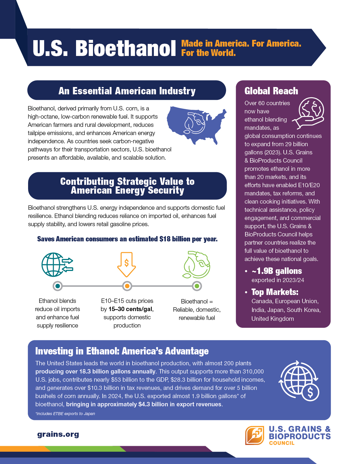 At the U.S. Grains & BioProducts Council, we believe biofuels such as bioethanol are vital to international transportation decarbonization efforts; and are dedicated to helping countries meet their global climate commitments as they fuel forward to a net-zero world. U.S. bioethanol provides an immediate solution to decarbonize road transportation with long-term potential to decarbonize long-haul trucking, aviation, and maritime transport. Bioethanol is: