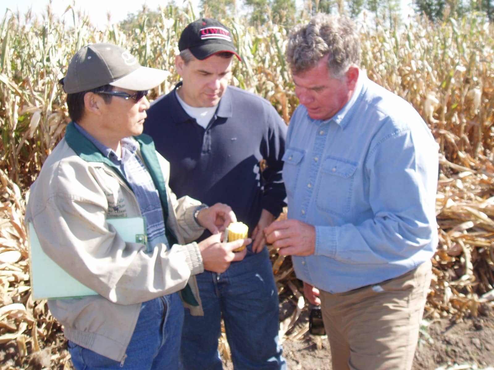 Sifferath (center), along with former Assistant Director in China Sam Niu (left) and Guy Davenport of North Carolina (right), can be seen here examining ears of corn in China during a 2009 mission.