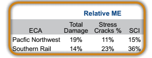 The Relative ME was calculated for each of the quality factors tested for this study at the U.S. Aggregate level and for each of the ECAs. The Relative ME was less than ± 10% for all the quality attributes at the U.S. Aggregate level and for the ECAs except for total damage, stress crack percent, and stress crack index for the Pacific Northwest and Southern Rail ECAs. The Relative ME for total damage, stress cracks percent and stress crack index were as follows:
