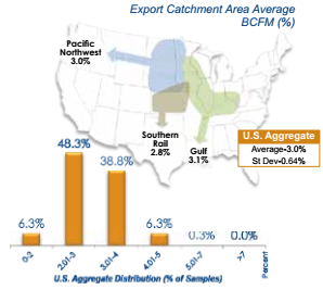 • U.S. Aggregate moisture content decreased between Harvest (15.6%) and Export Cargo samples (14.3%) due mainly to drying and conditioning in the market channel following harvest deliveries.