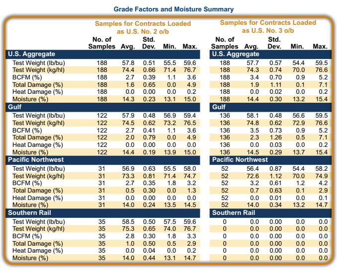 • U.S. Aggregate BCFM in each grade was below the limits for the respective contract grade (2.7% on U.S. No. 2 o/b and 3.4% on U.S. No. 3 o/b).