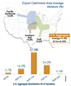 • Moisture is specified in the contract by the buyer, and as a result, differences in moisture content among grades was less than 0.5 percentage points (ranging from 14.0 to 14.4%), still below safe transit levels especially during colder temperatures.