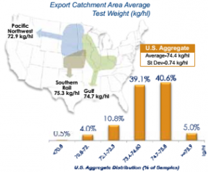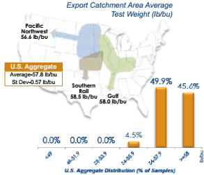 • Test weight was high with U.S. Aggregate samples averaging 57.8 lb/bu (74.4 kg/hl).