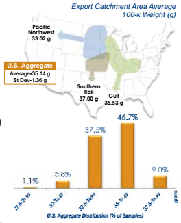 - 100-k weight averaged 35.14 g for U.S. Aggregate Export corn sampleswith a