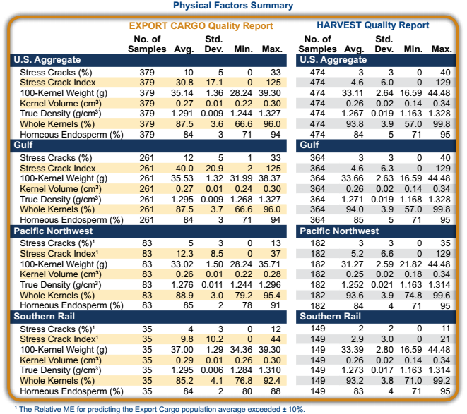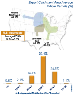 - Whole kernels in Export Report samples were still relatively high and should help corn maintain quality during storage and enable relatively low breakage during handling.