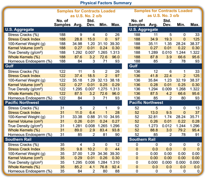 - Horneous endosperm percentages were similar between contracts loaded as U.S. No. 2 o/b and those loaded as U.S. No. 3 o/b.