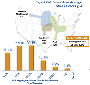 - Distribution of percentage of stress cracks showed 93.4% of the samples with less than 20% stress cracks at export. While this was lower than the 98.1% at harvest, it indicates the corn should still handle very well with relatively low amounts of breakage. The percent of stress cracks for the Gulf, Pacific Northwest and Southern Rail ECAs was low with 12%, 5%, and 4%, respectively. The Gulf ECA’s average stress cracks were significantly higher than the other two ECAs.