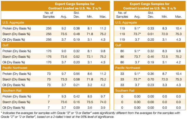 - Starch in contracts loaded as U.S. No. 2 o/b (73.5%) was lower than in contracts loaded as U.S. No. 3 o/b (73.7%). This is the opposite for protein and consistent with the inverse relationship between starch and protein.