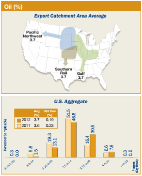 - Oil averages for the Gulf, Pacific Northwest, and Southern Rail ECAs were each 3.7%. About 85% of the 2012/13 export samples contained at least 3.5% oil, in contrast to 75% of the 2011/12 export samples.