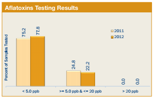 - 88 samples or 22.2%, of the samples showed aflatoxins in levels greater than or equal to 5.0 ppb but less than the FDA action level of 20 ppb, compared to 24.8% of the samples tested for the 2011/12 exports.
