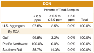 - 100% of the export samples tested were below or equal to the FDA action level of 20 ppb, the same percentage as for the 2011/12 export samples tested. 2. DON (Deoxynivalenol or Vomitoxin) Testing Results All 397 samples for the Export Cargo Report 2012/13 were tested for DON. Results of the testing are shown below: