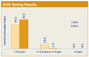 - 387 samples (97.5%) had less than 0.5 ppm of DON compared to 84.2% of the 2011/12 export samples.