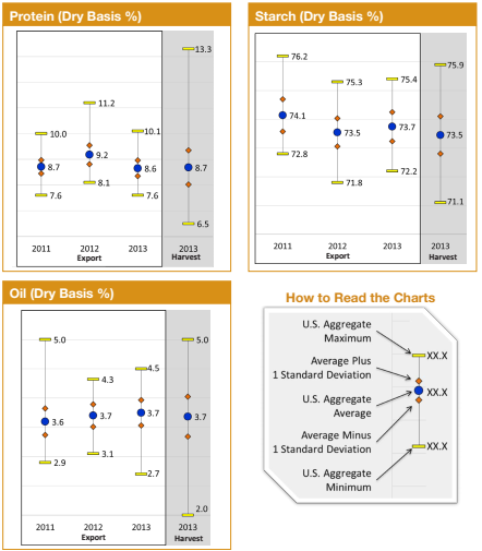 - Protein, starch and oil all had narrower ranges and lower standard deviations at export than at harvest. This finding is, in part, due to grains becoming more homogenous after aggregation from numerous harvest level sources.