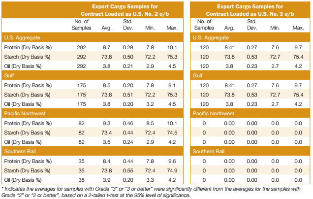 - Average starch content for the Gulf ECA in contracts loaded as U.S. No. 2 o/b (73.8%) was the same as for contracts loaded as U.S. No. 3 o/b (73.8%).