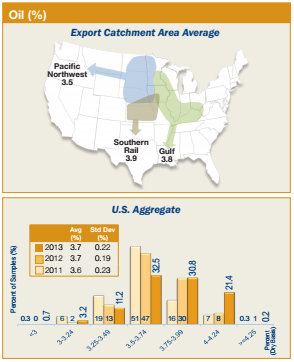 - Oil content averages for the Gulf, Pacific Northwest and Southern Rail ECA export samples were 3.8%, 3.5% and 3.9%, respectively. The Pacific Northwest ECA also had the lowest average oil content (3.5%) for the 2013 harvest samples.