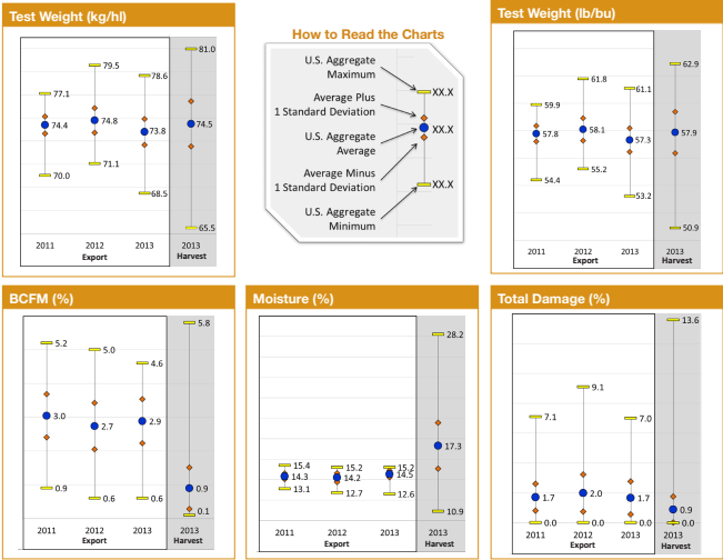 - Test weight at export (57.3 lb/bu) was lower than test weight at harvest (57.9 lb/bu). This has been consistent for the previous two years.