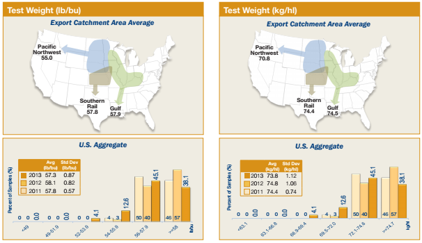 - Average test weight was lower than previous years (57.3 lb/bu (73.8 kg/hl)), but still above the limit for Grade U.S. No. 1.