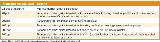 Humans and livestock are sensitive to mycotoxins at varying levels. As a result, the U.S. Food and Drug Administration (FDA) has issued action levels for aflatoxins and advisory levels for DON by intended use.