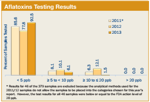 - 6 samples or 1.5% of the 412 samples tested had aflatoxin levels greater than or equal to 10.0 ppb, but less than the FDA action level of 20 ppb. This 1.5% is less than the 12.1% of the 2012/13 export samples and 6.3% of the 2011/12 export samples.