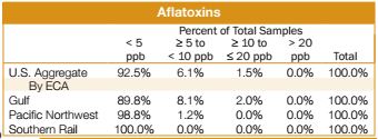 - 381 samples or 92.5% of the 412 samples tested had no detectable levels of aflatoxins (defined as less than 5.0 ppb or the FGIS lower reporting level). This 92.5% is greater than the 77.8% of the 2012/13 export samples and 85.6% of the 2011/12 export samples.