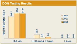 - 391 samples or 94.9% of the 412 samples tested had levels less than 0.5 ppm of DON. This 94.9% is less than the 97.5% of the 2012/13 export samples but greater than the 84.2% of the 2011/12 export samples.