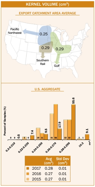 - Kernel volume range (0.22 to 0.32 cm3) was similar to 2016/2017 (0.24 to 0.31 cm3) and 2015/2016 (0.23 to 0.31 cm3).
