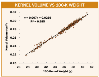 Kernel volume in cubic centimeters (cm3) is often indicative of growing conditions. Small or round kernels are more difficult to degerm. Additionally, small kernels may lead to increased cleanout losses for processors and higher yields of fiber.