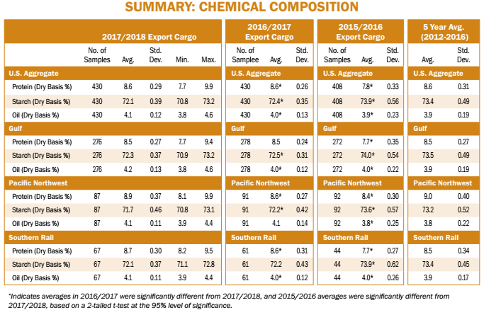 The chemical composition of corn consists primarily of protein, starch and oil. Although they are not grade factors, these attributes are of significant interest to end users. They provide information related to nutritional value for livestock and poultry feeding, for wet milling uses and for other processing uses of corn. Unlike many physical attributes, chemical composition values are not expected to change significantly during storage or transit.  Variability is usually less at export than at harvest as a result of commingling from many originations.