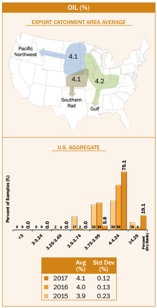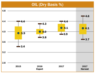 • Average U.S. Aggregate oil concentration (4.1%) was higher than 2016/2017, 2015/2016 and 5YA, but the same as the 2017 harvest average.