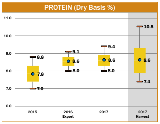 • The 2017/2018 export samples were distributed with 72.6% of protein concentrations at or above 8.5%, compared with 70% of the 2016/2017 samples and 10% of the 2015/2016 samples.