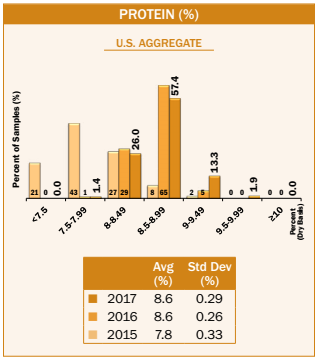 • Average U.S. Aggregate protein concentration at export (8.6%) was the same as 2016/2017, higher than 2015/2016, and the same as 5YA and the 2017 harvest average.