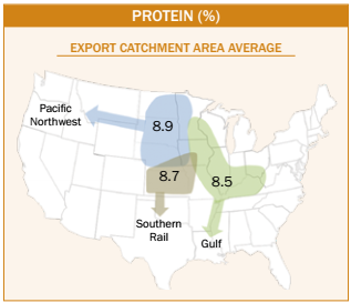 • The Gulf ECA (8.5%) had a lower average protein concentration than the Pacific Northwest (8.9%) and the Southern Rail (8.7%) ECAs.